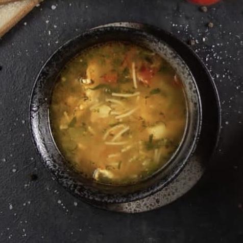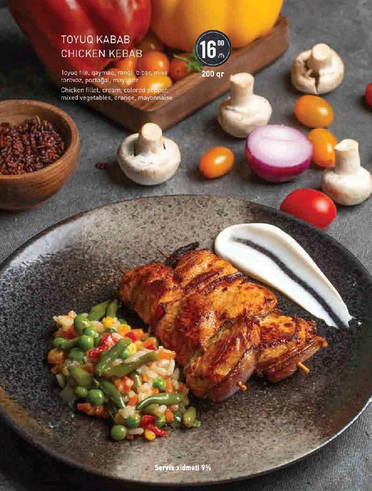Toyuq filesi , göbələk , soğan , pomidor , ...