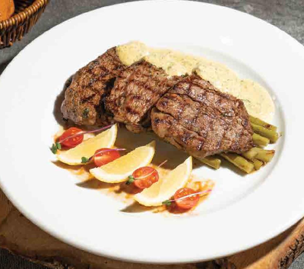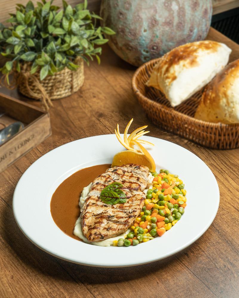 Toyuq sinə əti, miks səbzə, demiqlas sousu,...