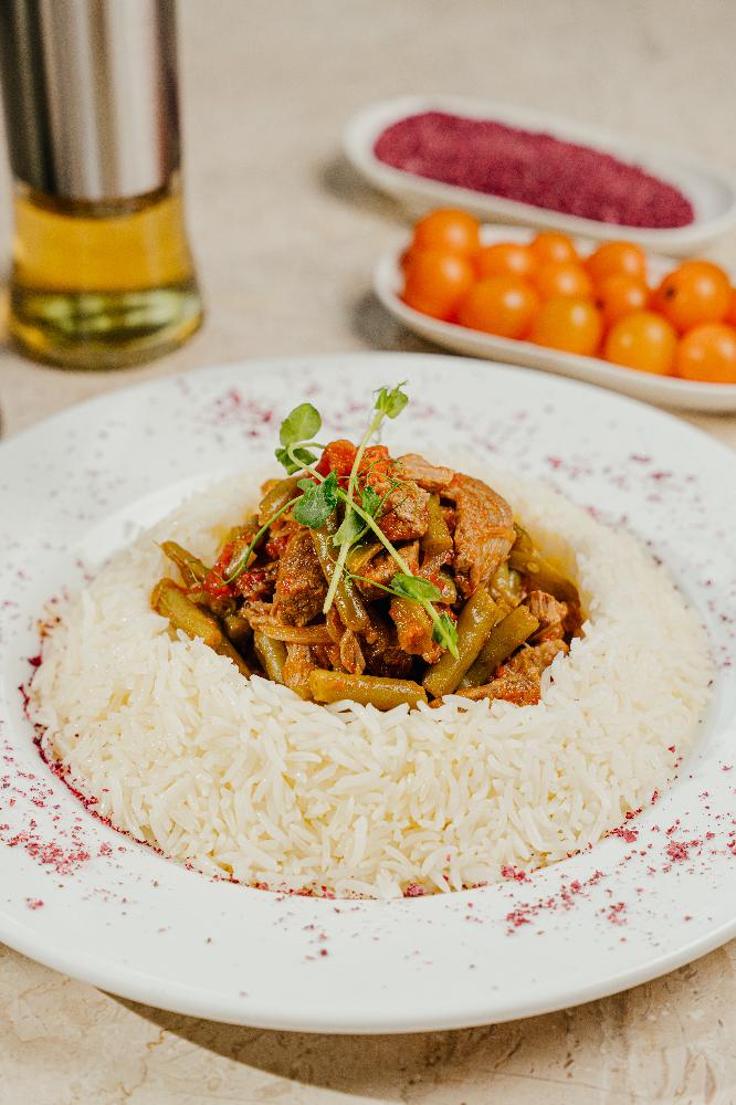 Quzu əti, soğan, pomidor, yaşıl lobya, düy...