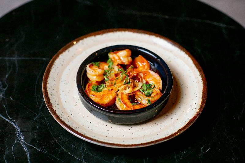 king prawn, garlic, greens, butter, chili peppe...