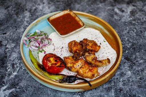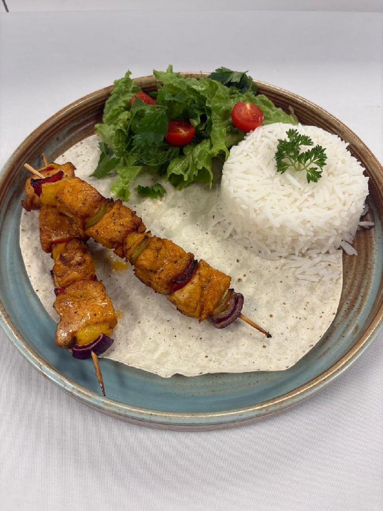 chicken skewers, bell pepper, onion,steamed ri...