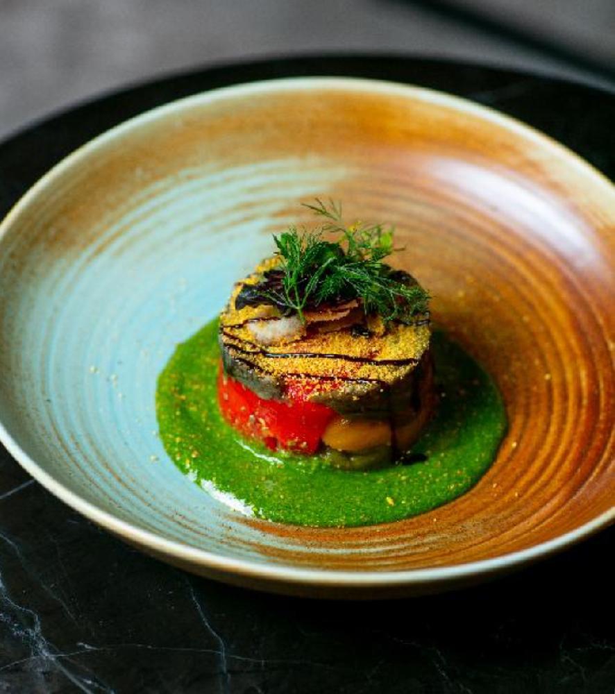 eggplant, bell peppers, labneh cheese, pesto sauce