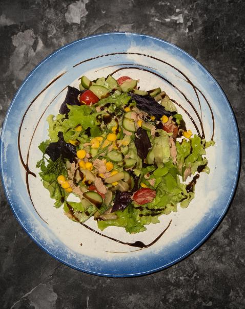 mixed greens, cherry tomatoes, canned corn, pic...