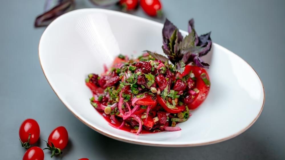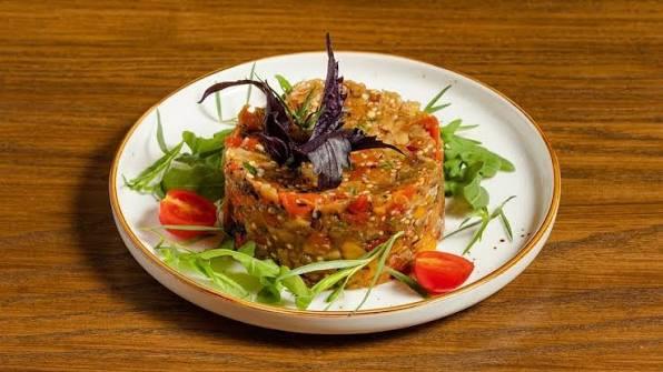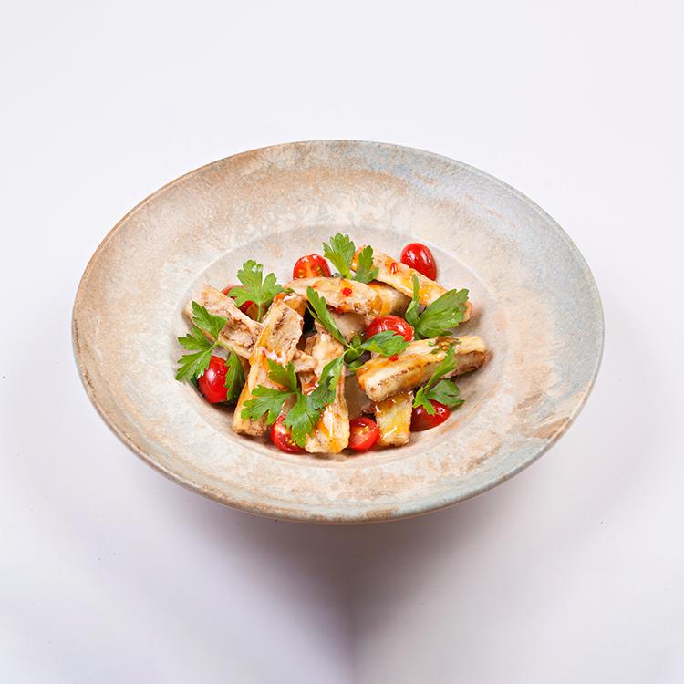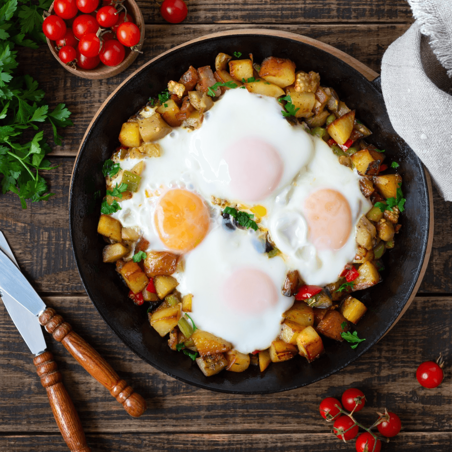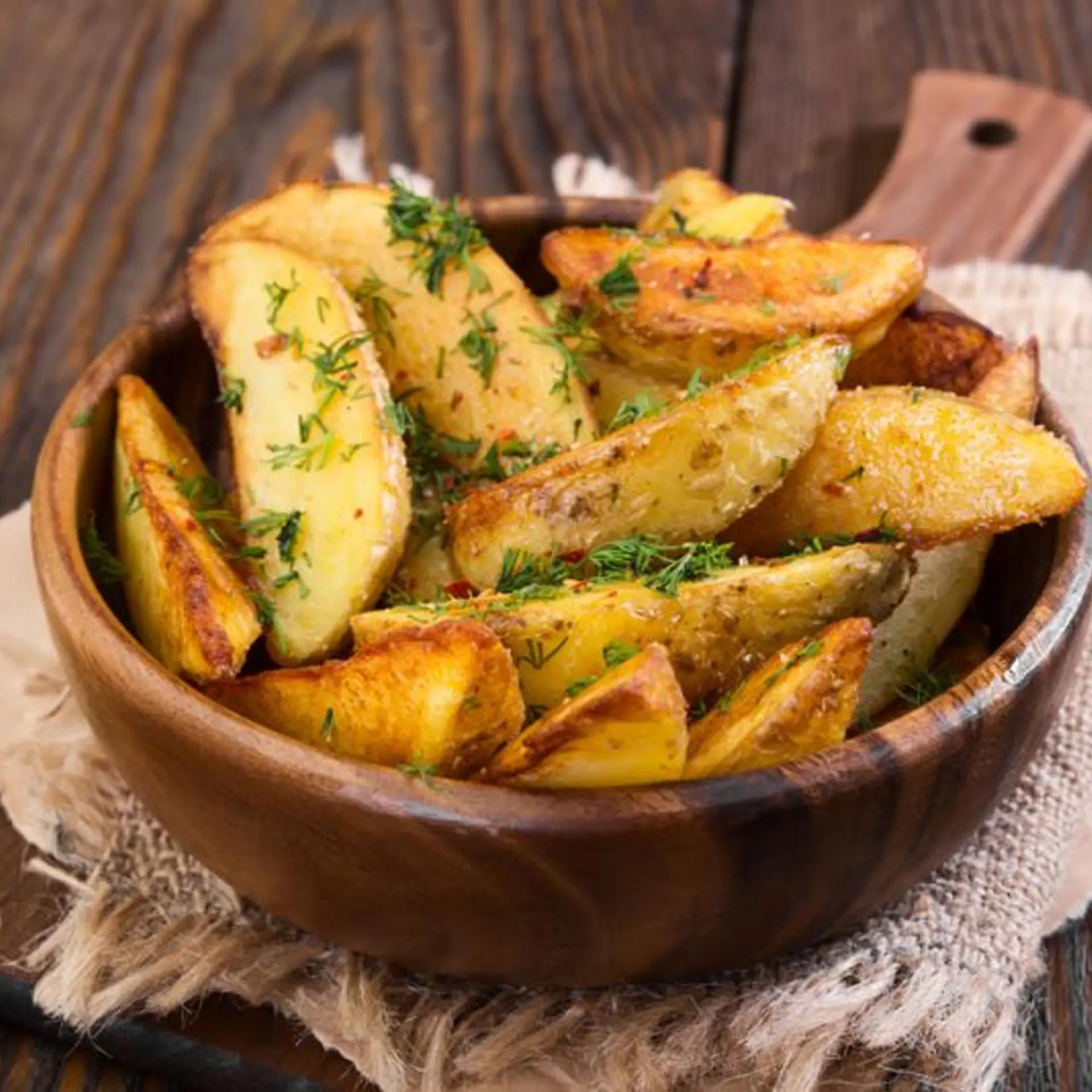 Sobada bişmiş kiçik kartoflar, rəngli bibərlər, soğan və xüsusi ədviyyatlar