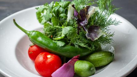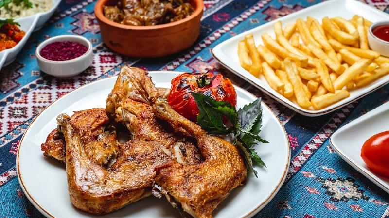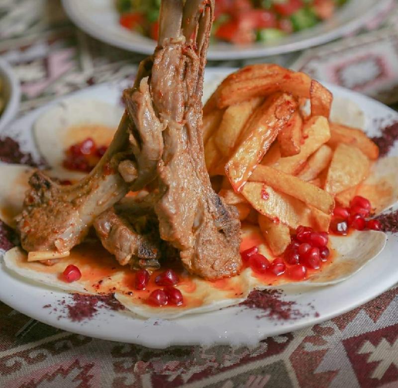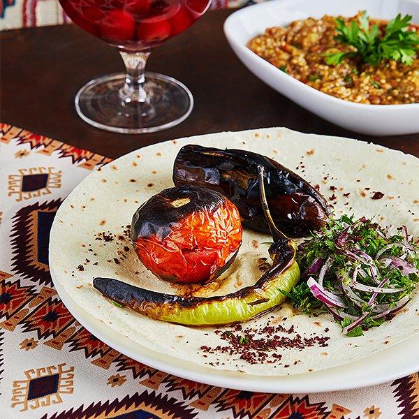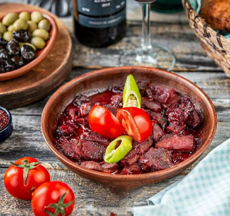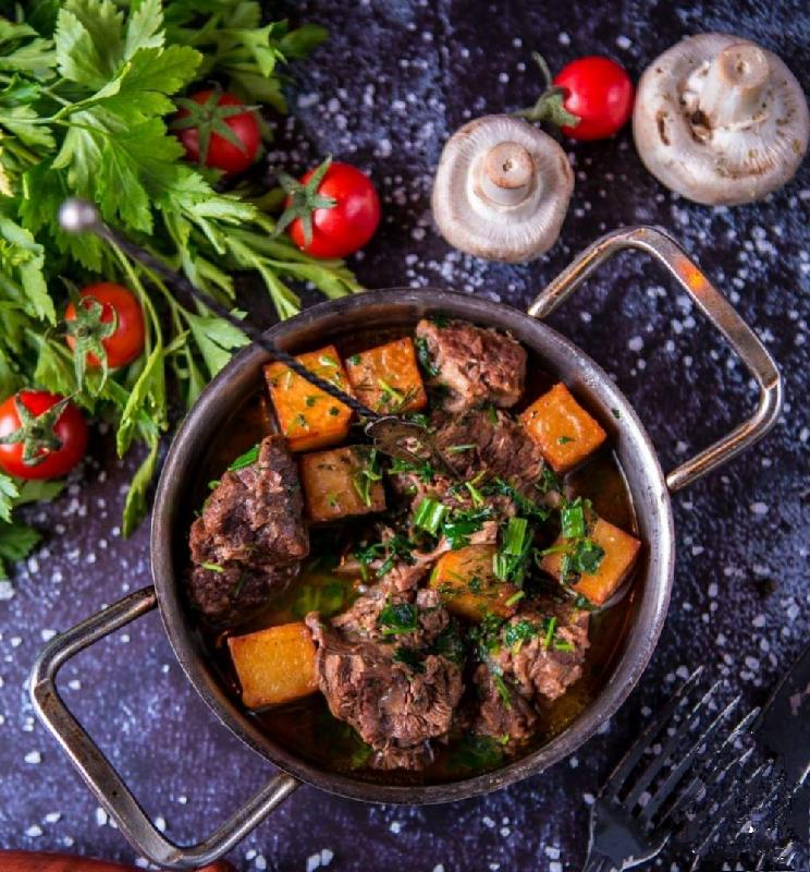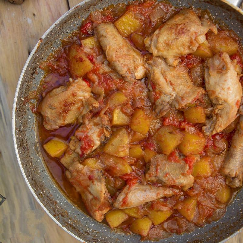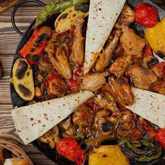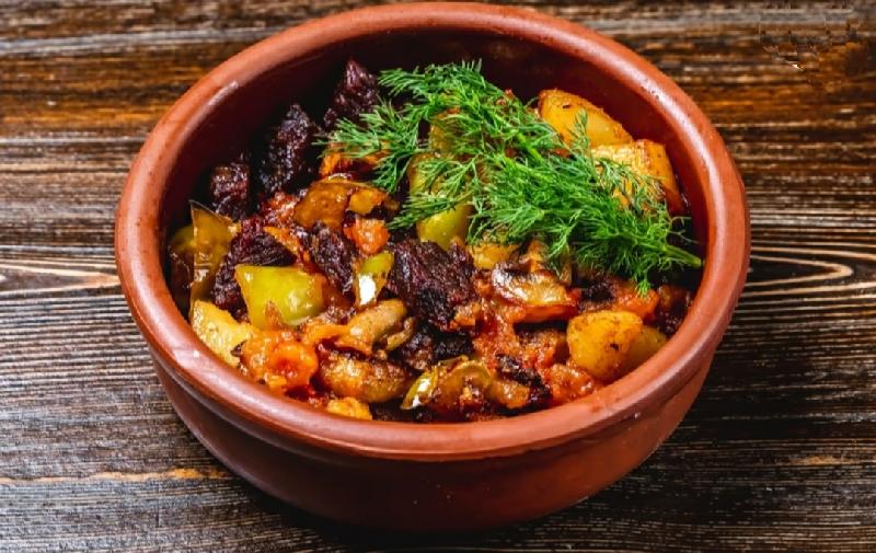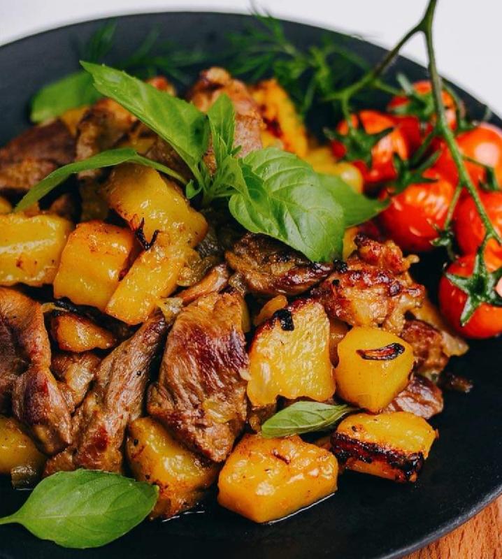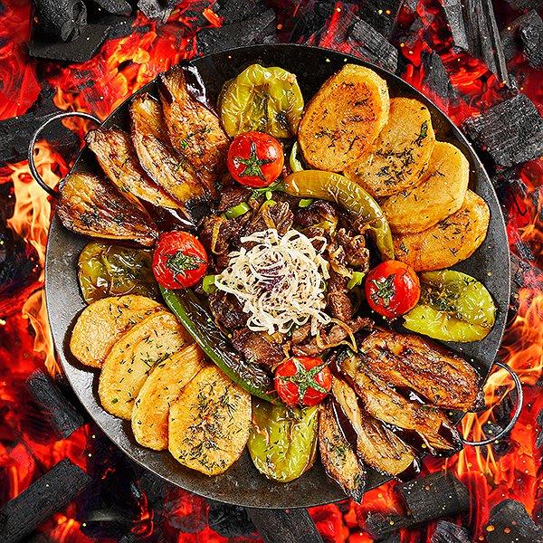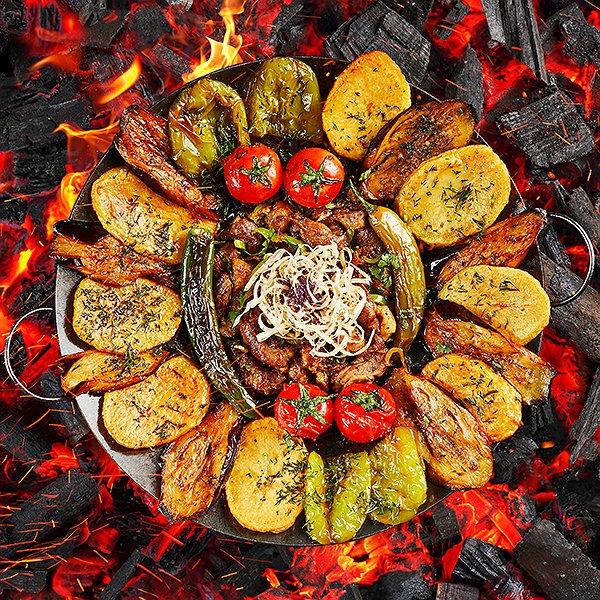 Sobada bişmiş kiçik kartoflar, rəngli bibərlər, soğan və xüsusi ədviyyatlar