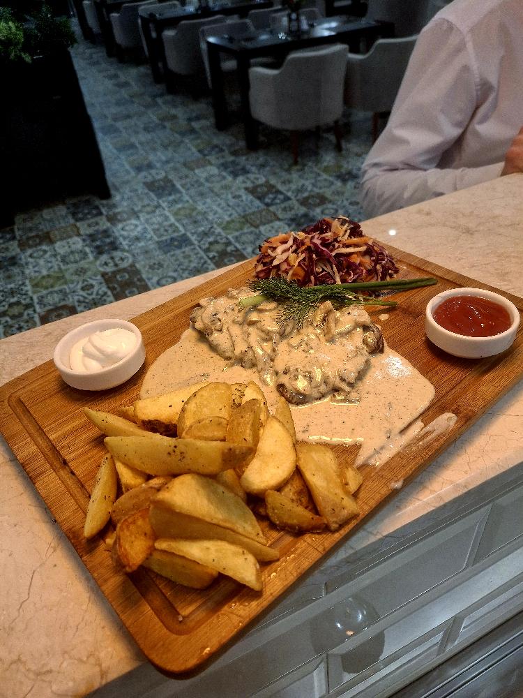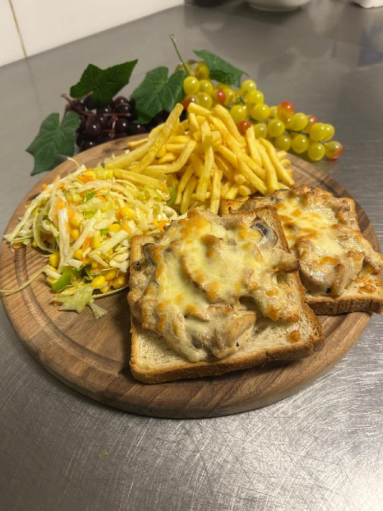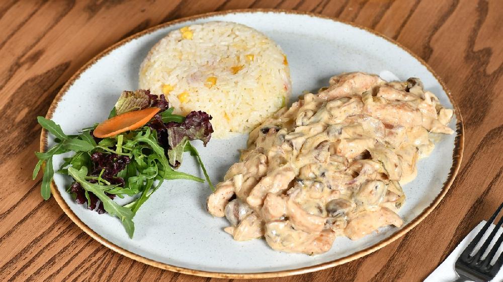 Toyuq sinə, göbələk, qaymaq, parmezan