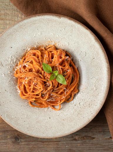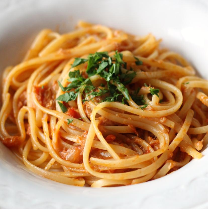 pasta, dana əti soğan, sarımsaq, pomidor sousu