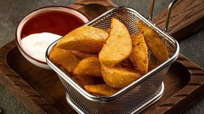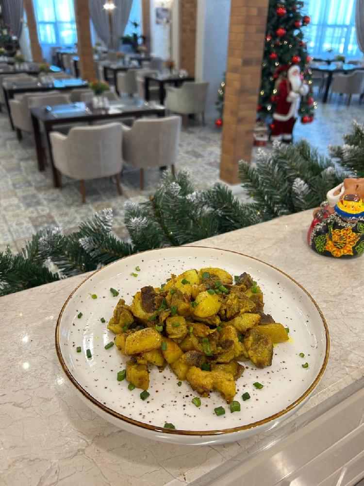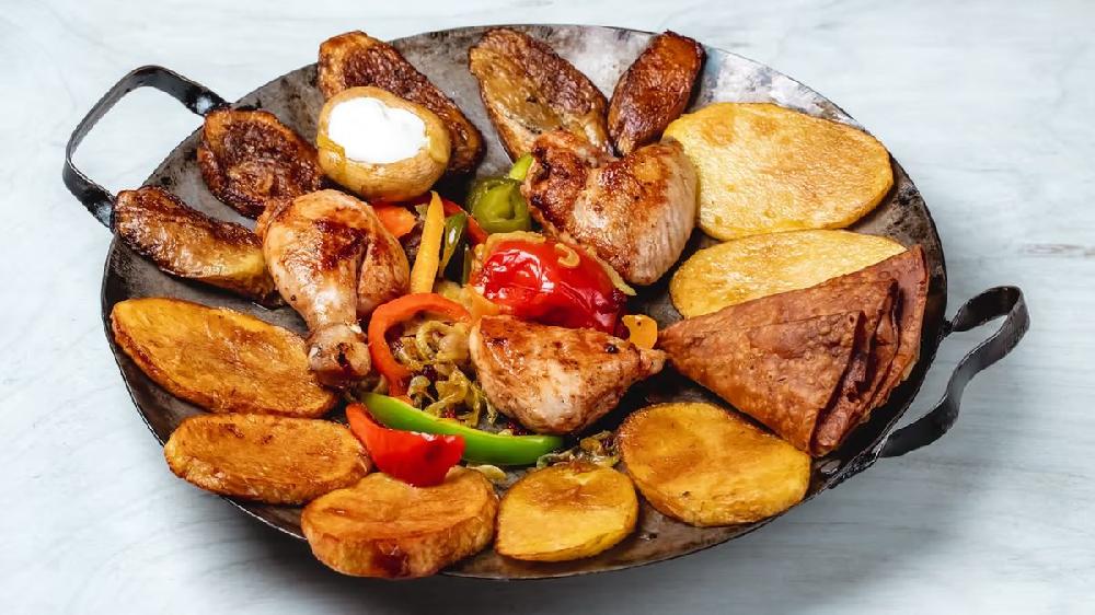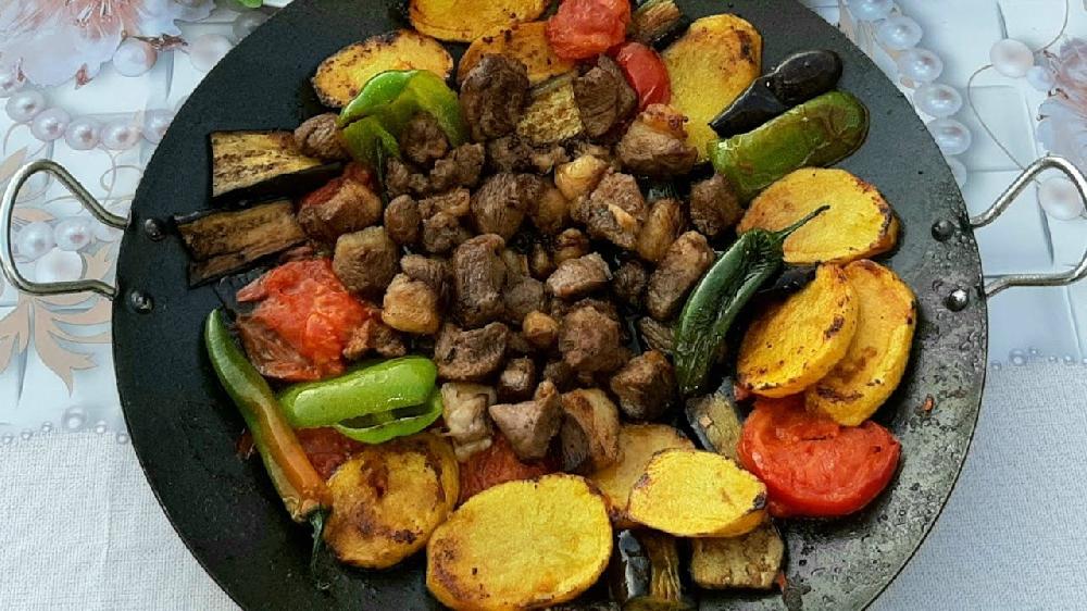 Sobada bişmiş kiçik kartoflar, rəngli bibərlər, soğan və xüsusi ədviyyatlar