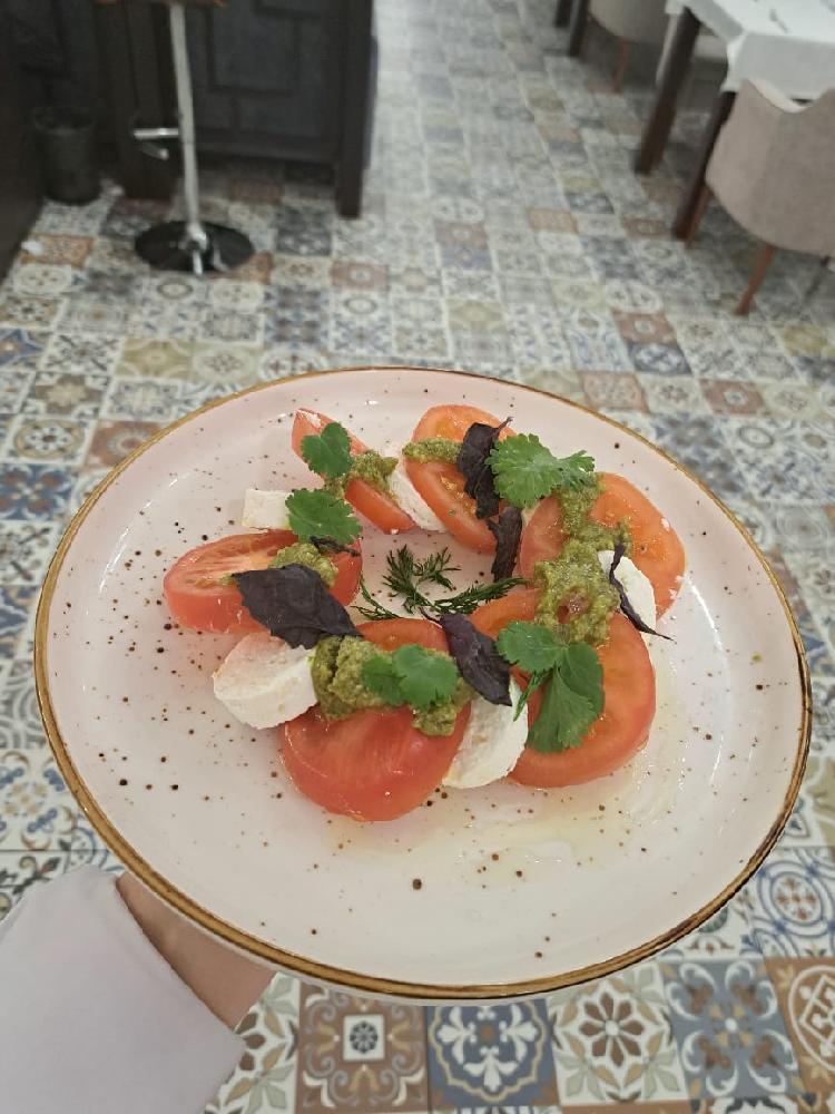 pomidor, pendir, pesto sous, nanə, zeytun yağı