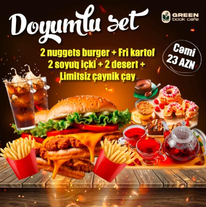 2 nuggets burger, 2 kartof fri, 2 soyuq içki, ...
