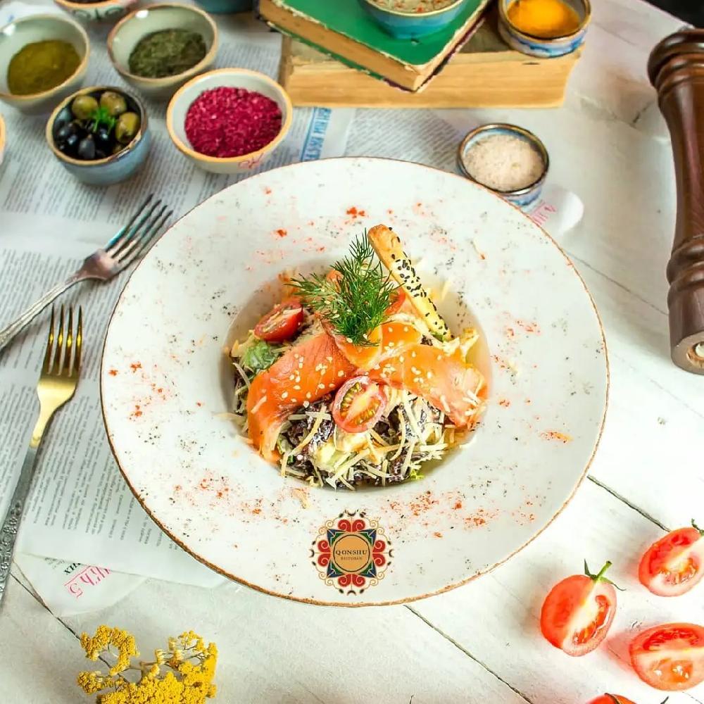 Balıq, aysberq, çery pomidor, suxarik, sous