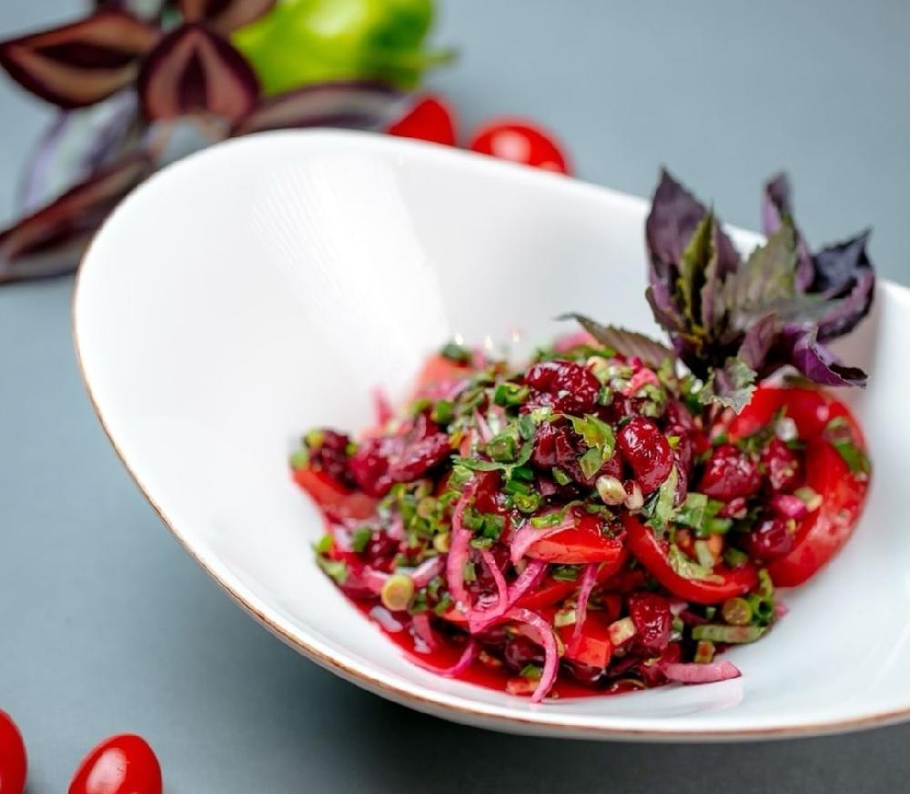 Albalı, pomidor, qırmızı soğan, turşu sous