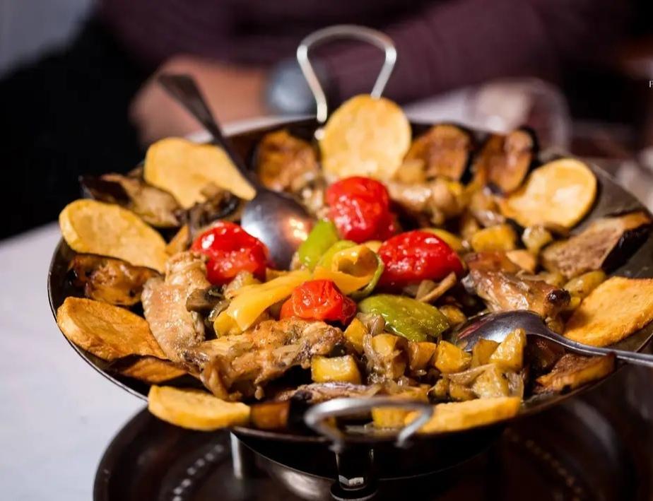 Sobada bişmiş kiçik kartoflar, rəngli bibərlər, soğan və xüsusi ədviyyatlar