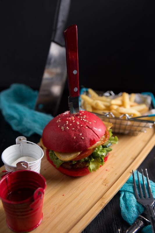 Qırmızı burger çörəyi, toyuq filesi, tur�...