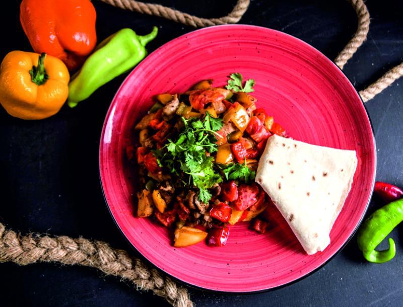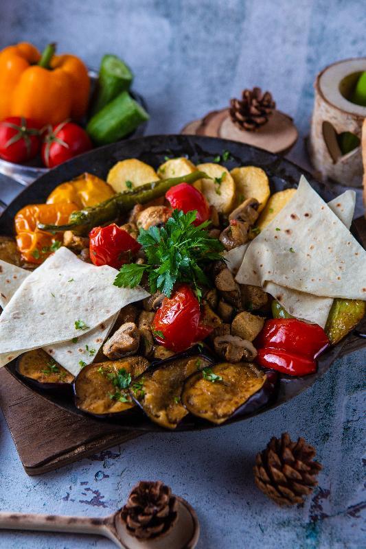Sobada bişmiş kiçik kartoflar, rəngli bibərlər, soğan və xüsusi ədviyyatlar