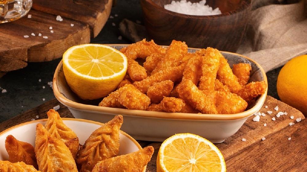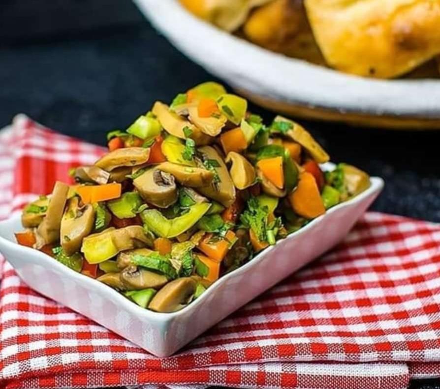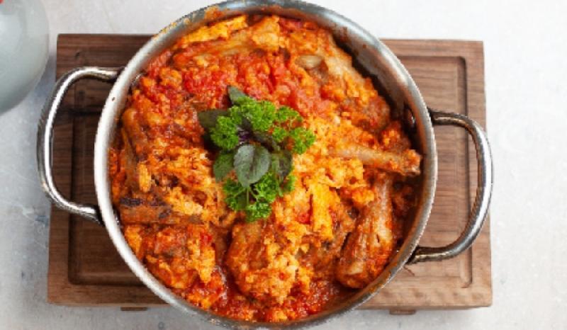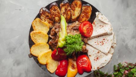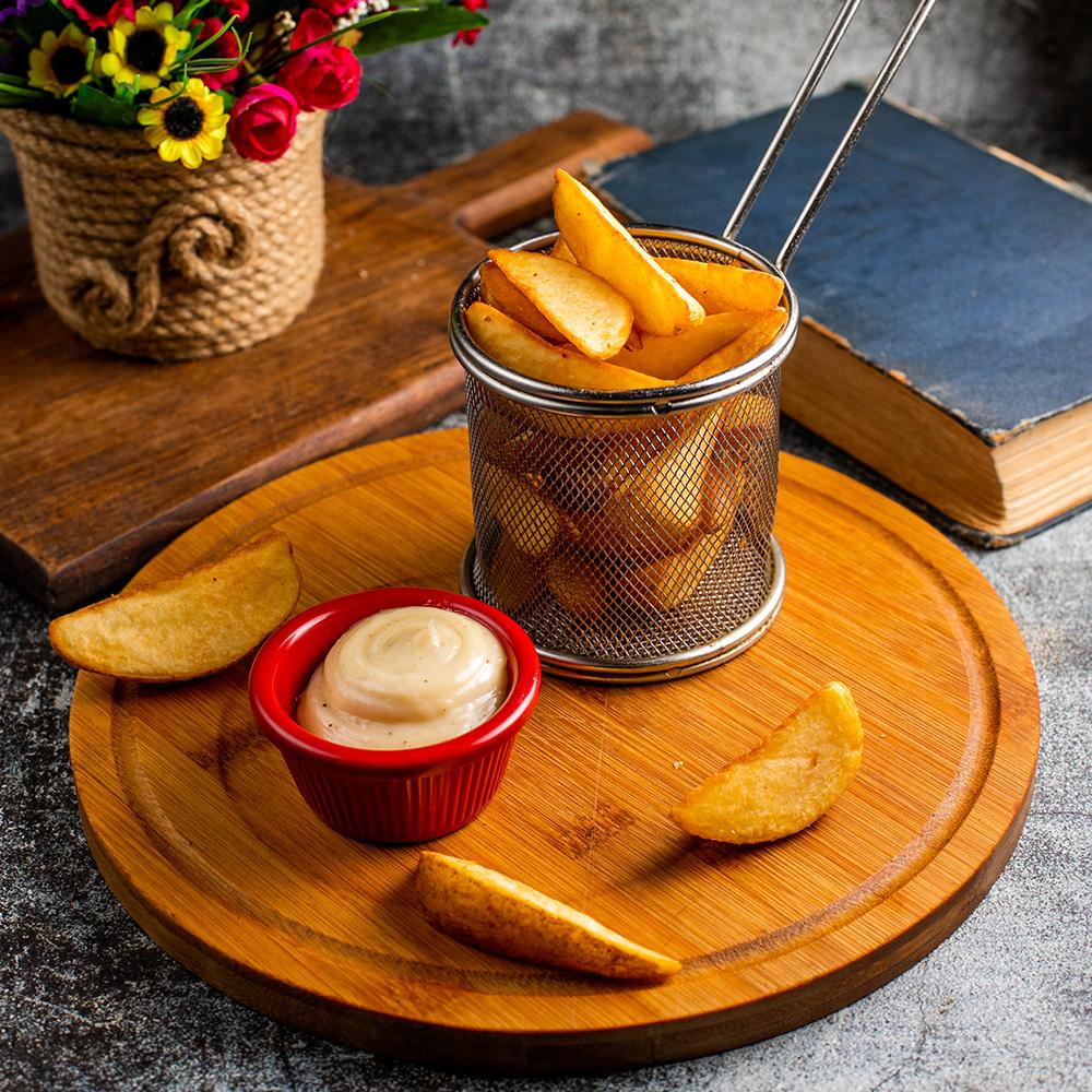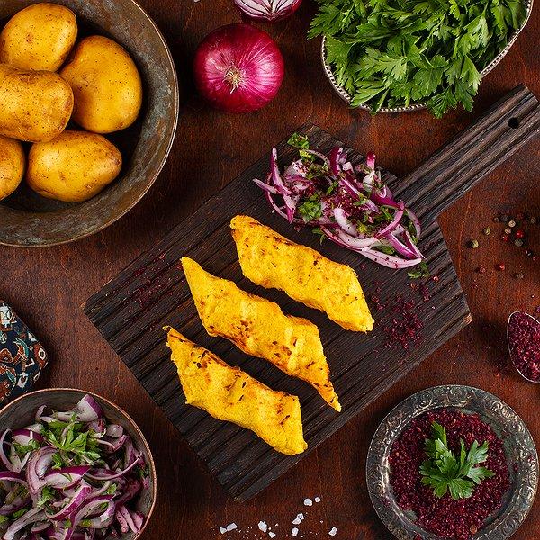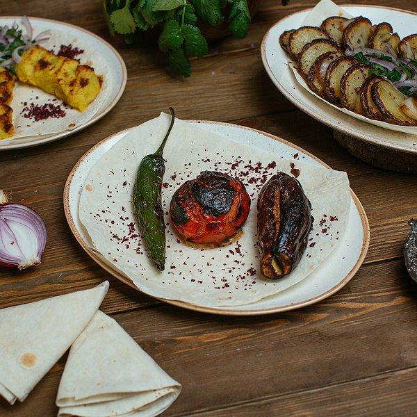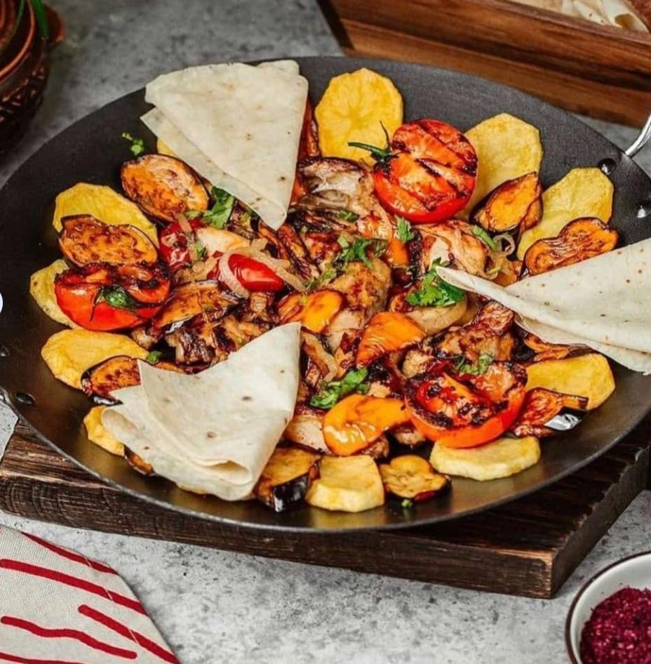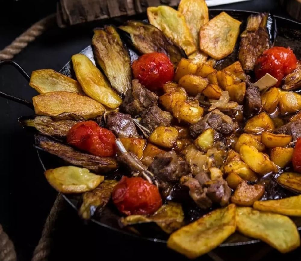 Sobada bişmiş kiçik kartoflar, rəngli bibərlər, soğan və xüsusi ədviyyatlar