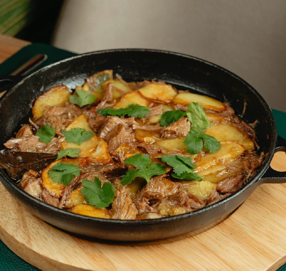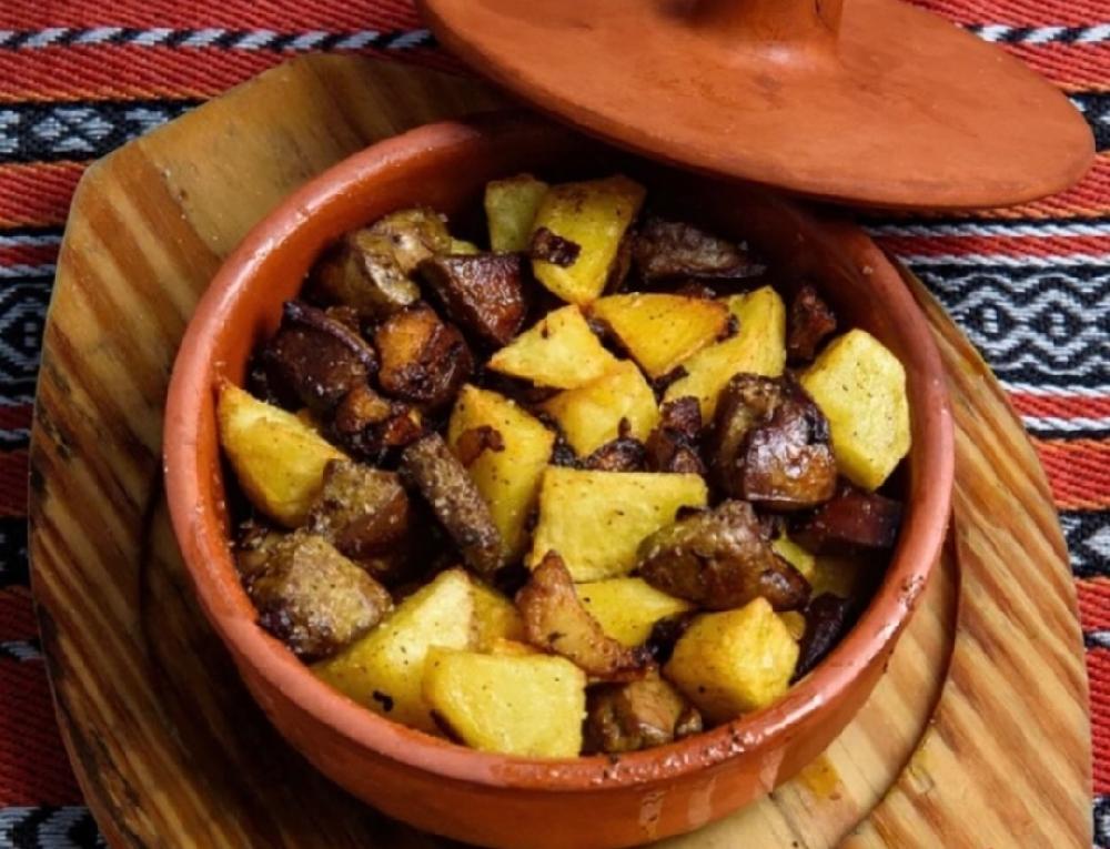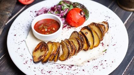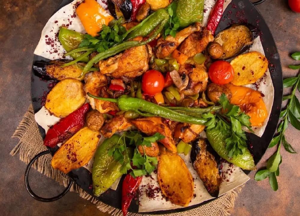 Sobada bişmiş kiçik kartoflar, rəngli bibərlər, soğan və xüsusi ədviyyatlar