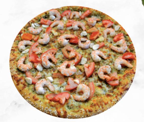 A delicious seafood pizza topped with shrimp, r...