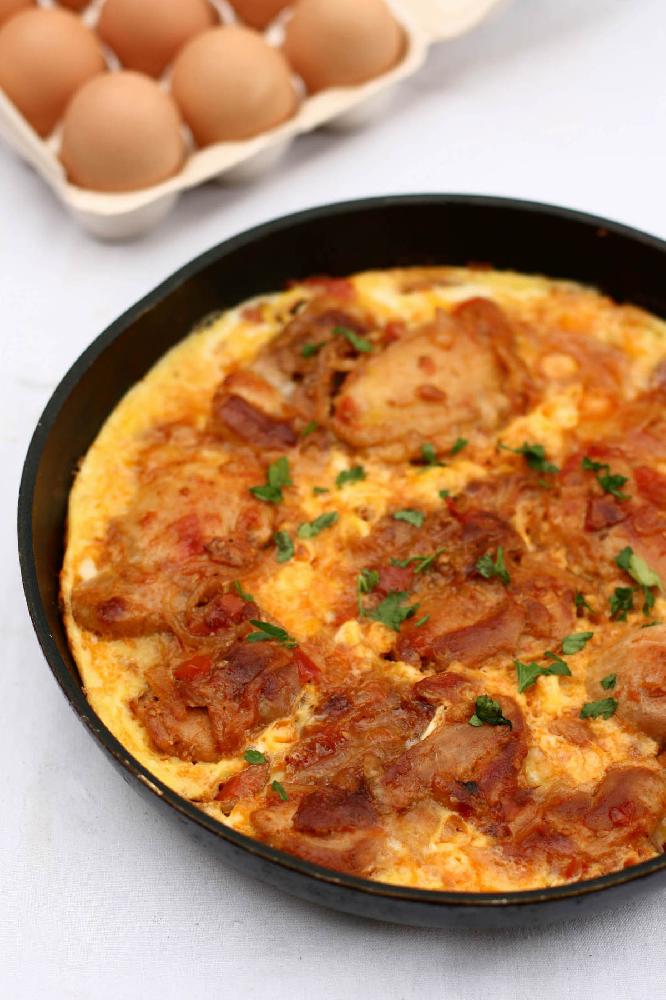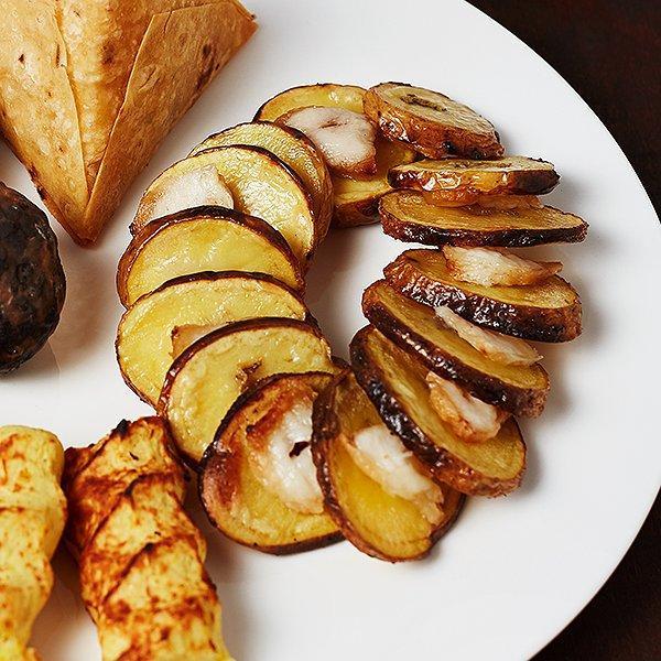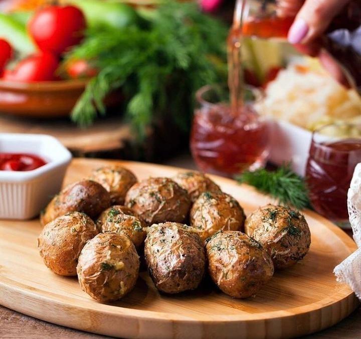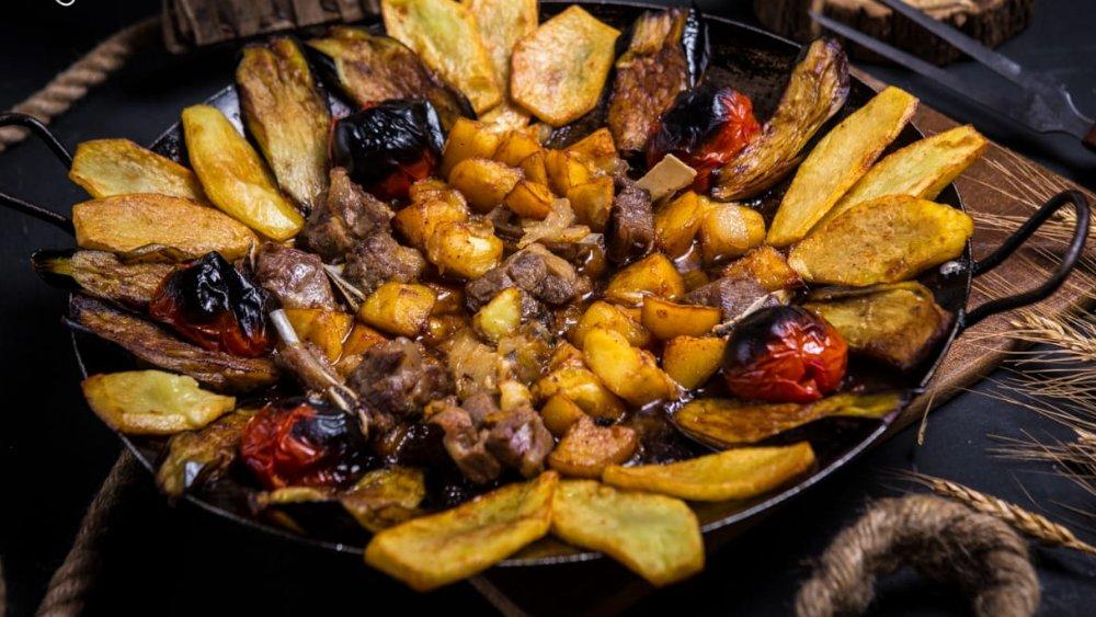 Sobada bişmiş kiçik kartoflar, rəngli bibərlər, soğan və xüsusi ədviyyatlar