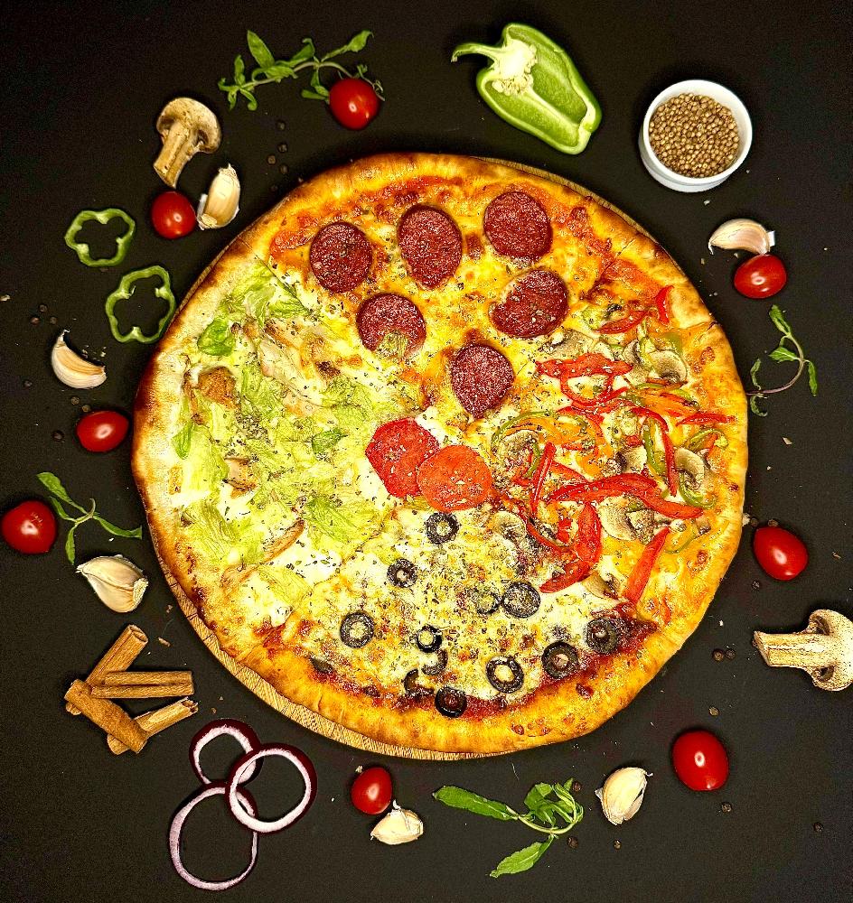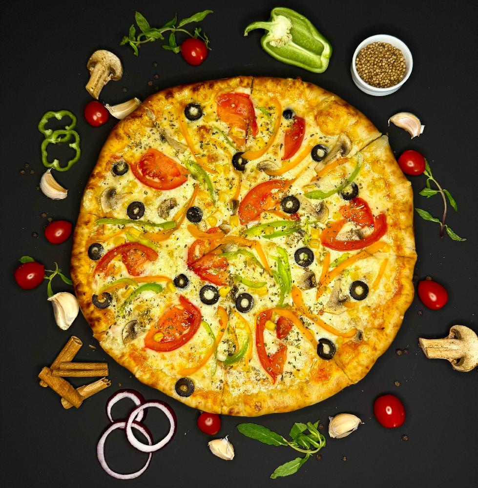 pomidor, göbələk, rəngli bibər, qara zeytu...