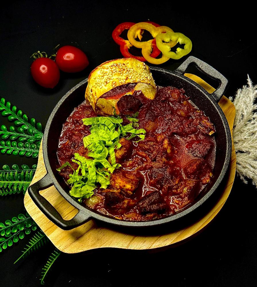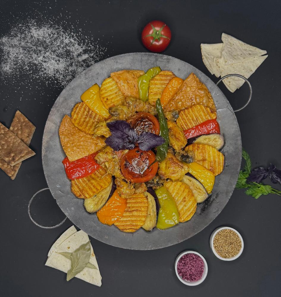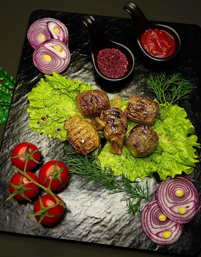 Sobada bişmiş kiçik kartoflar, rəngli bibərlər, soğan və xüsusi ədviyyatlar