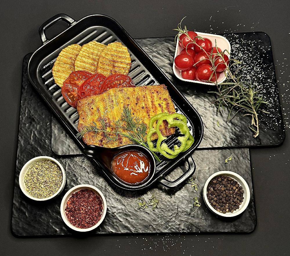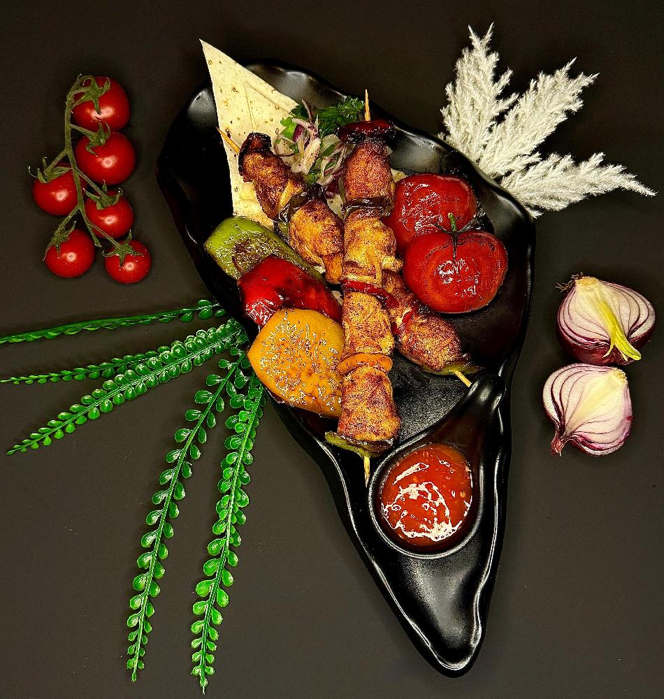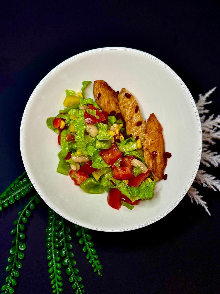 toyuq filesi, rəngli bibər, pomidor, ağ loby...