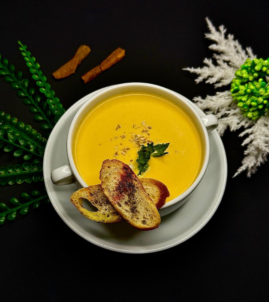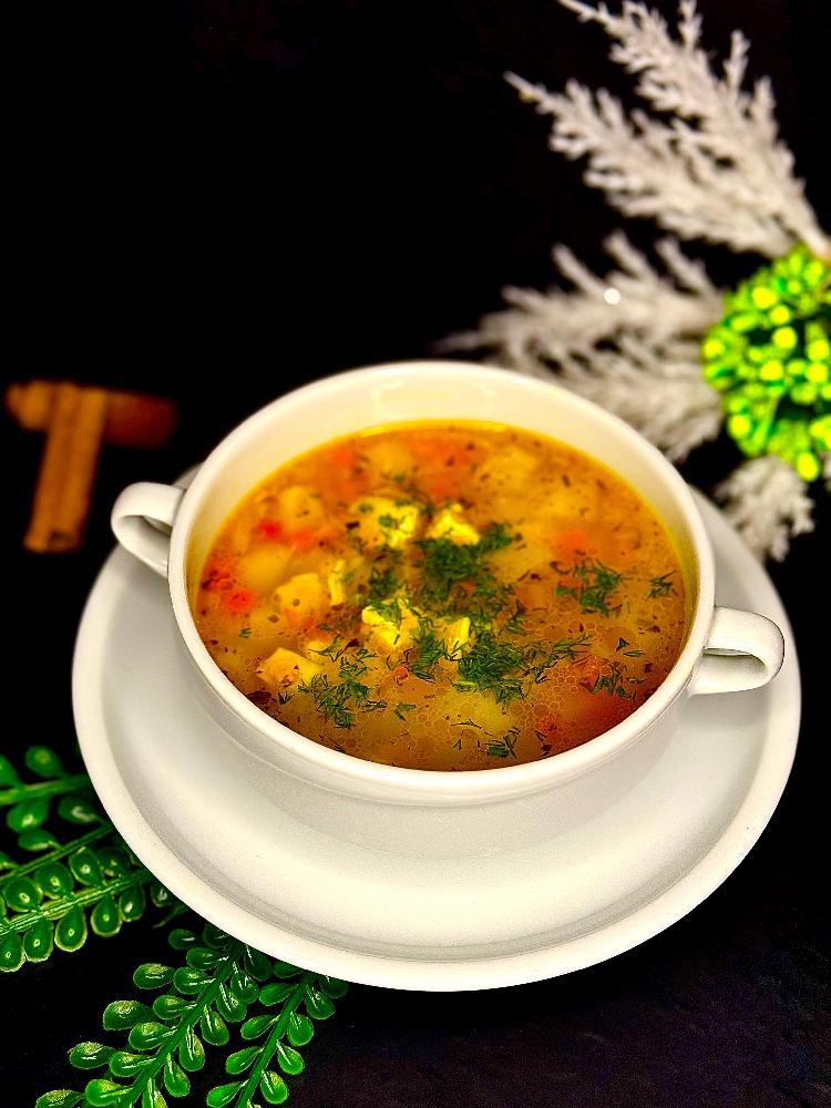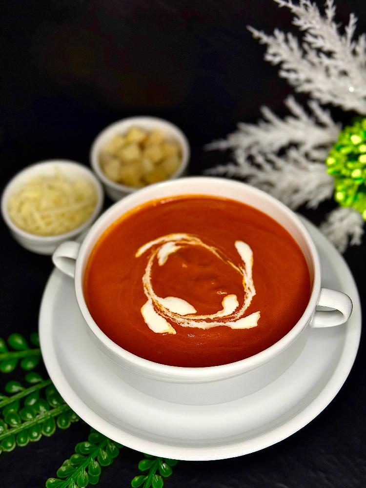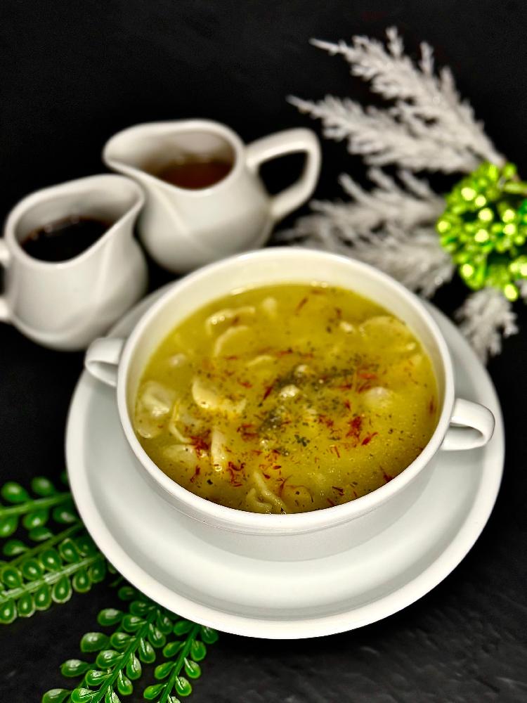 Toyuq şorbası, pomidor salatı, çörək, mey...