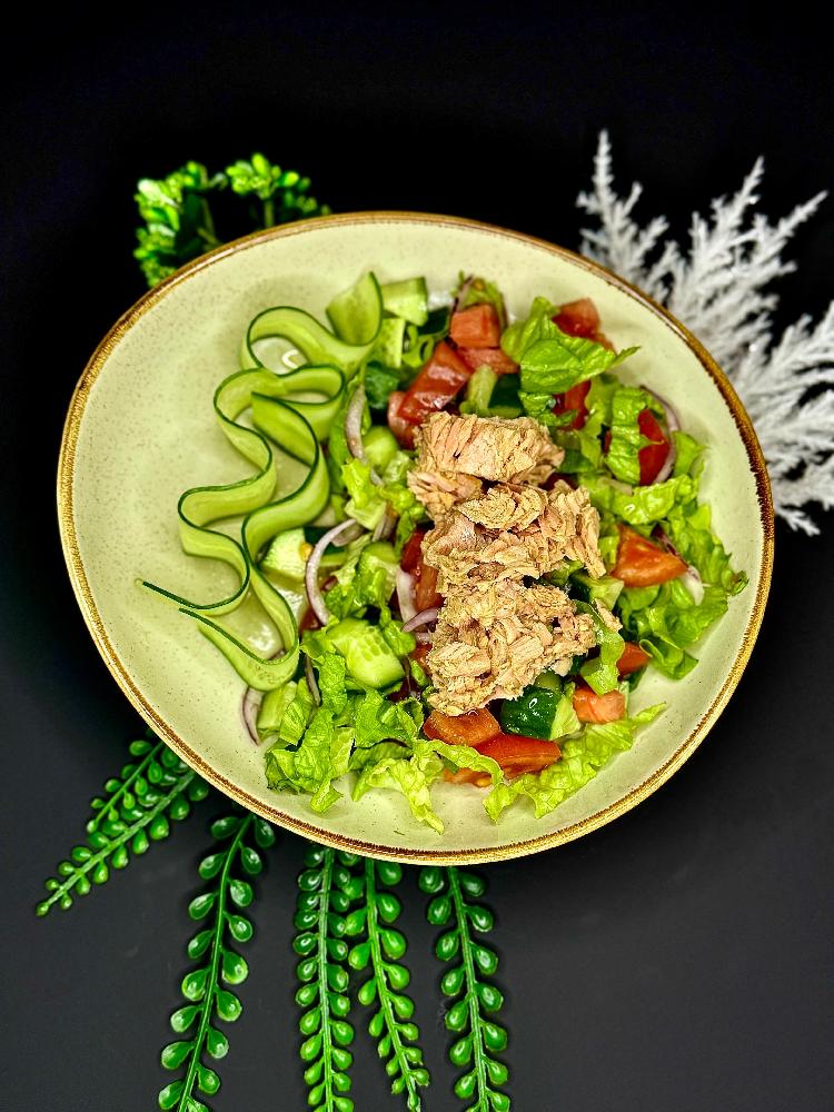 tuna balığı, pomidor, xiyar, kahı, qara zeytun