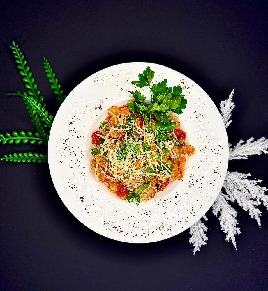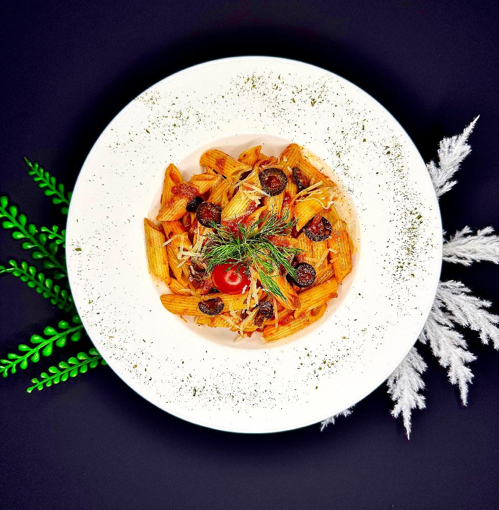 penne pasta, pomidor, qara zeytun, bibər, soğ...