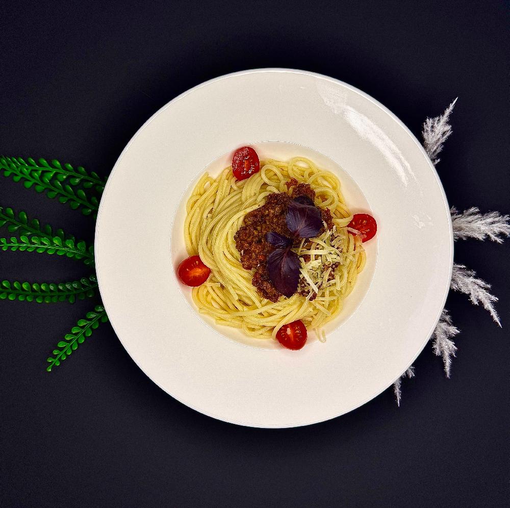 spagetti pasta, mal əti farşı, kök, soğan,...