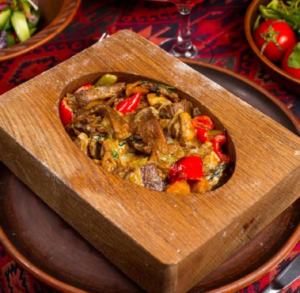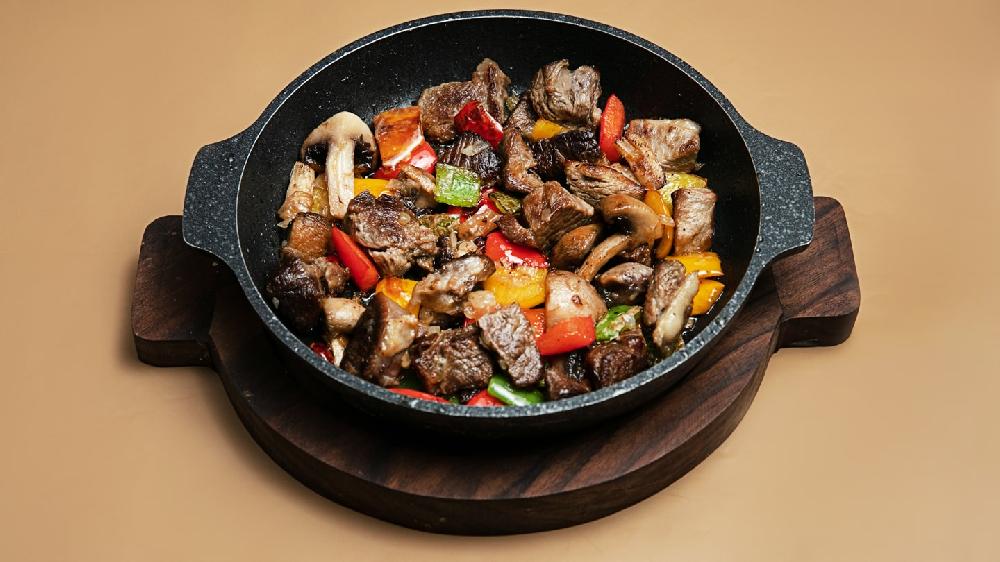 Dana əti, pomidor, soğan, rəngli bibər, sar...