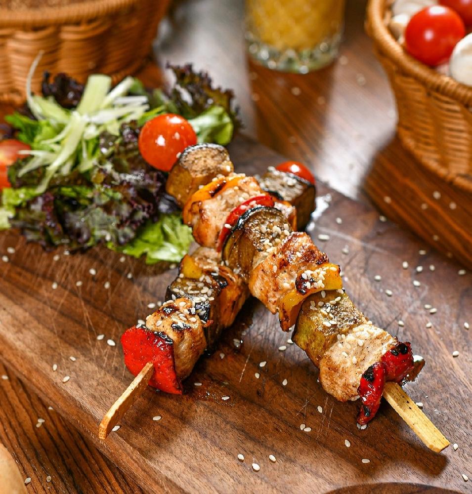 Badımcan, sweetchili sous, bolqar bibəri, kah...