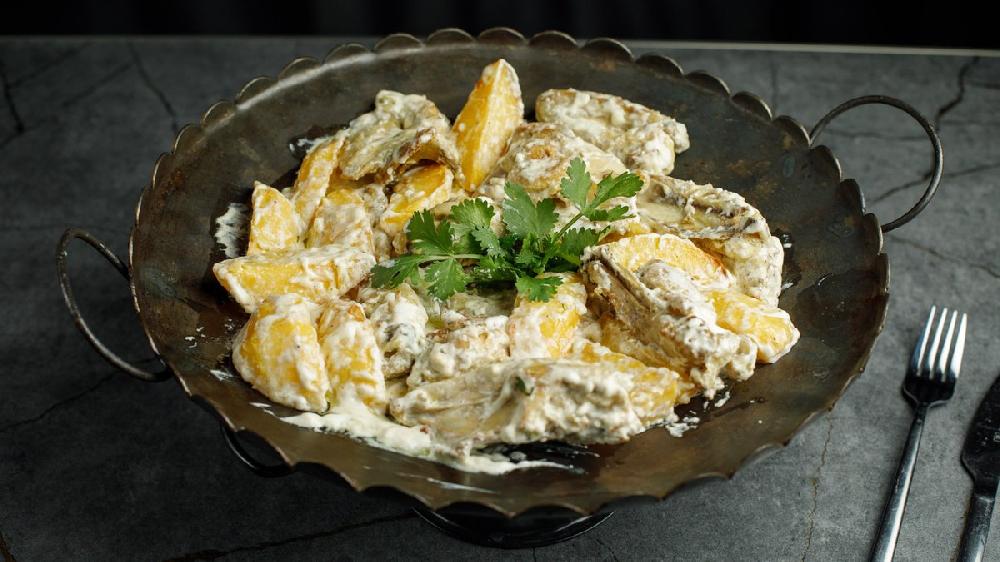 Sobada bişmiş kiçik kartoflar, rəngli bibərlər, soğan və xüsusi ədviyyatlar