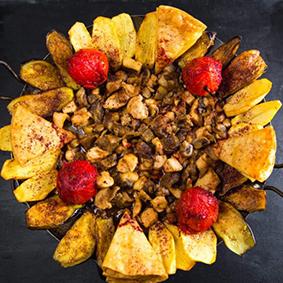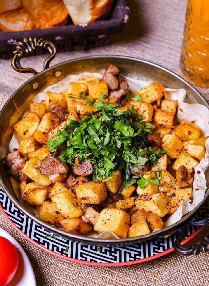 Sobada bişmiş kiçik kartoflar, rəngli bibərlər, soğan və xüsusi ədviyyatlar