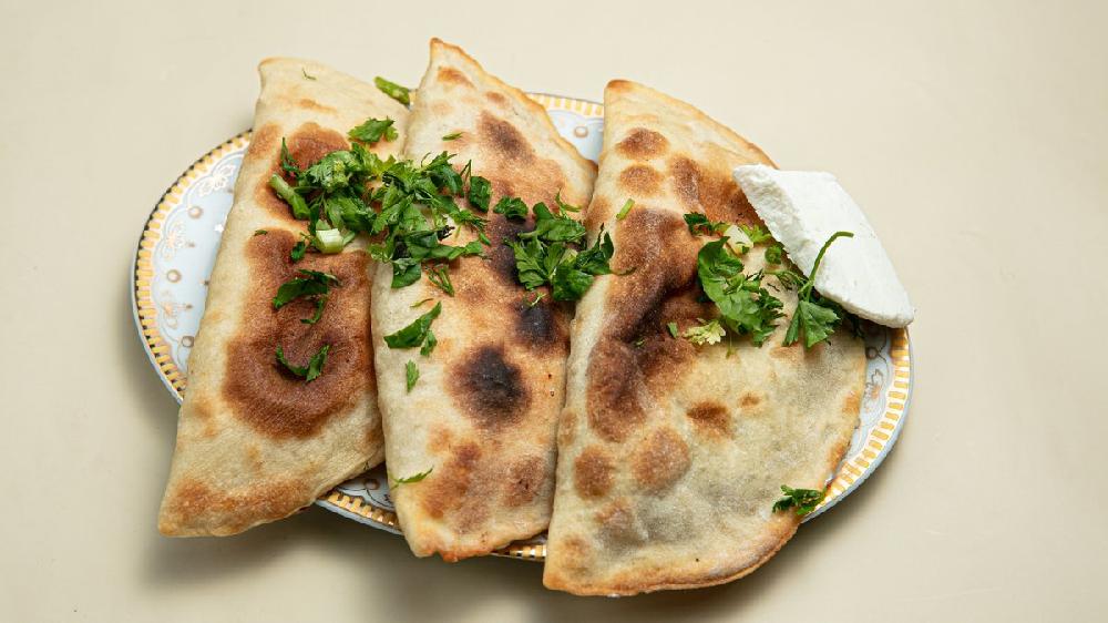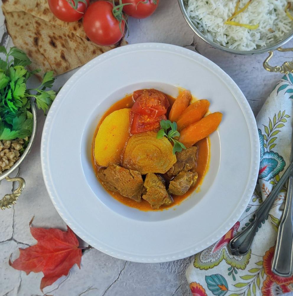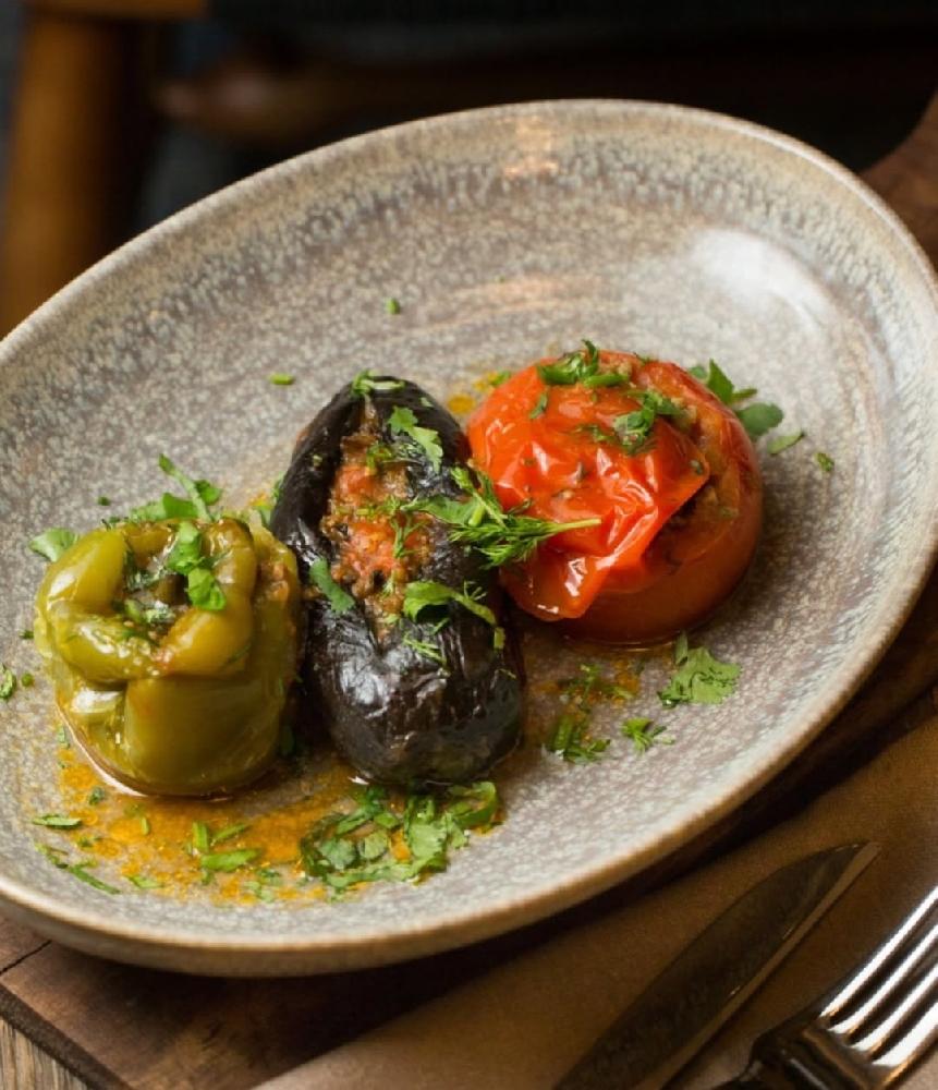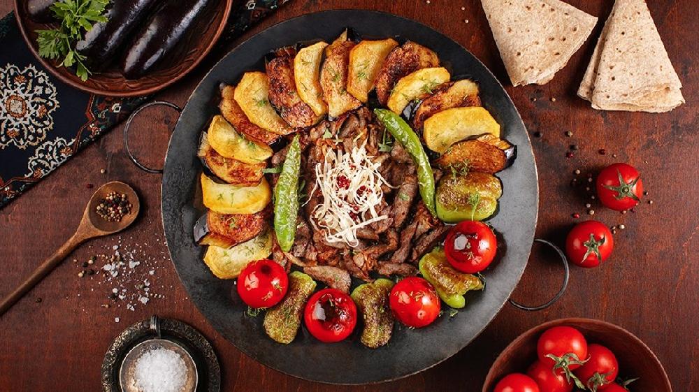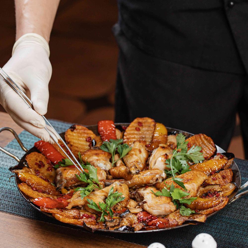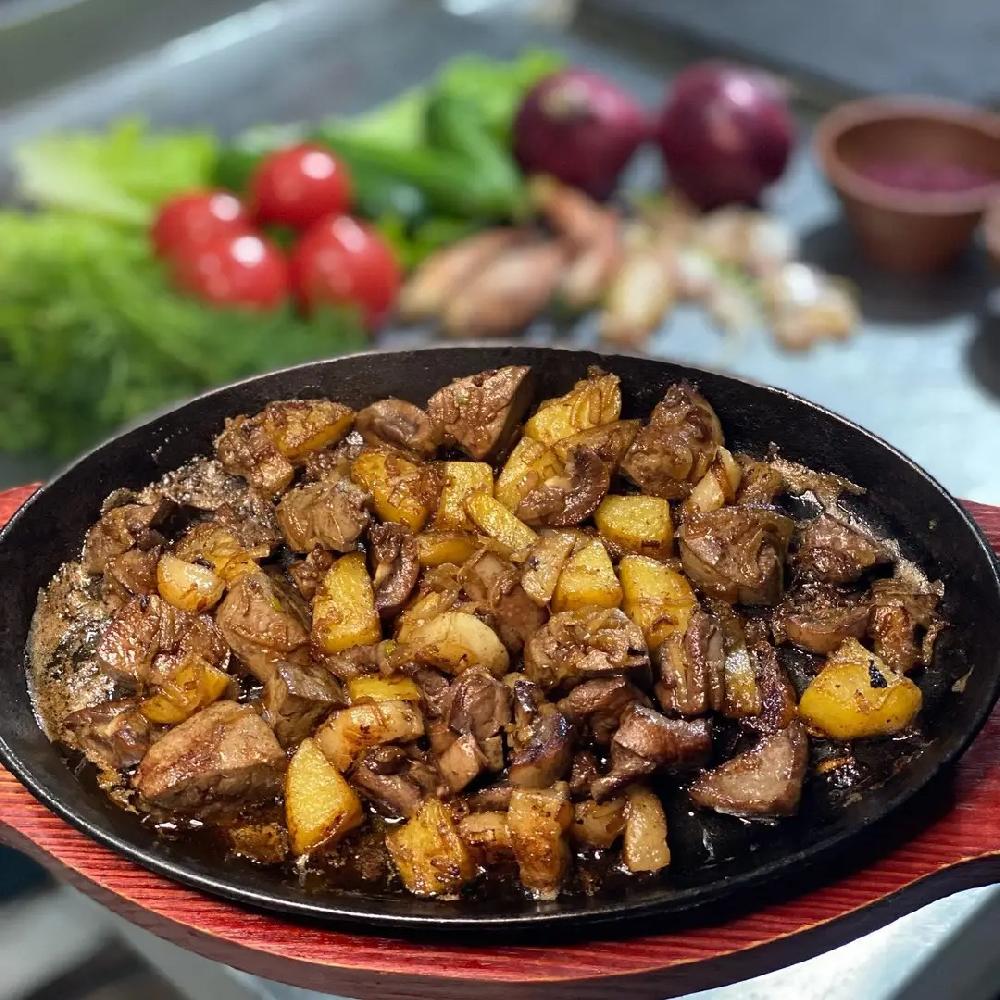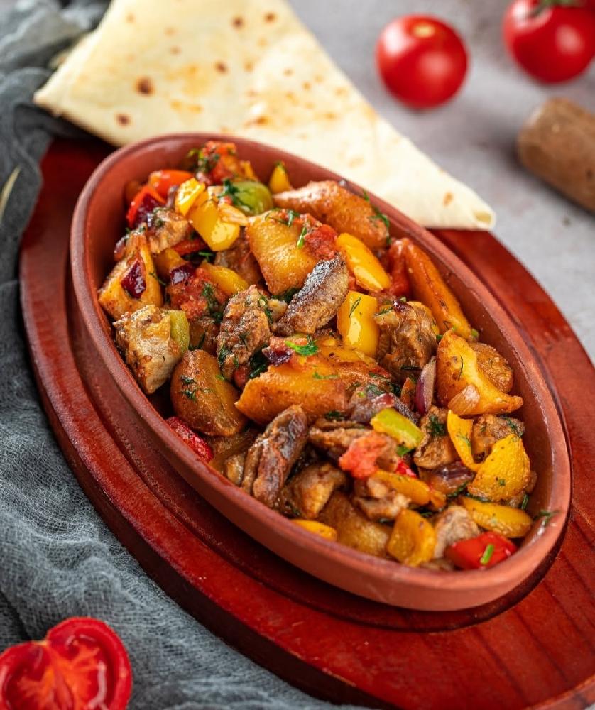Sobada bişmiş kiçik kartoflar, rəngli bibərlər, soğan və xüsusi ədviyyatlar